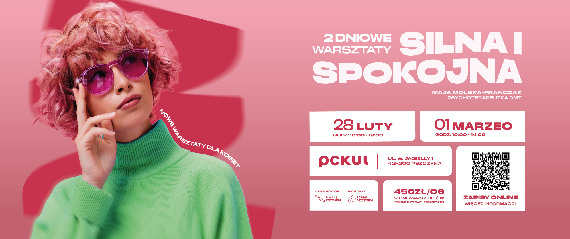 Administratorem danych osobowych jest Fundacja Przymierze, ul. Wyzwolenia 2, 43-267 Suszec. Dane osobowe przetwarzane są w celu rejestracji i organizacji warsztatów „Silna i spokojna”, kontaktu organizacyjnego oraz realizacji obowiązków księgowych. Podstawą przetwarzania danych jest art. 6 ust. 1 lit. b i c RODO. Dane mogą być przetwarzane także w celach promocyjnych (wizerunek) lub informacyjnych wyłącznie na podstawie odrębnej, dobrowolnej zgody.
